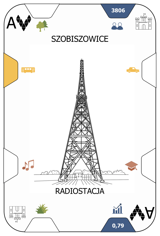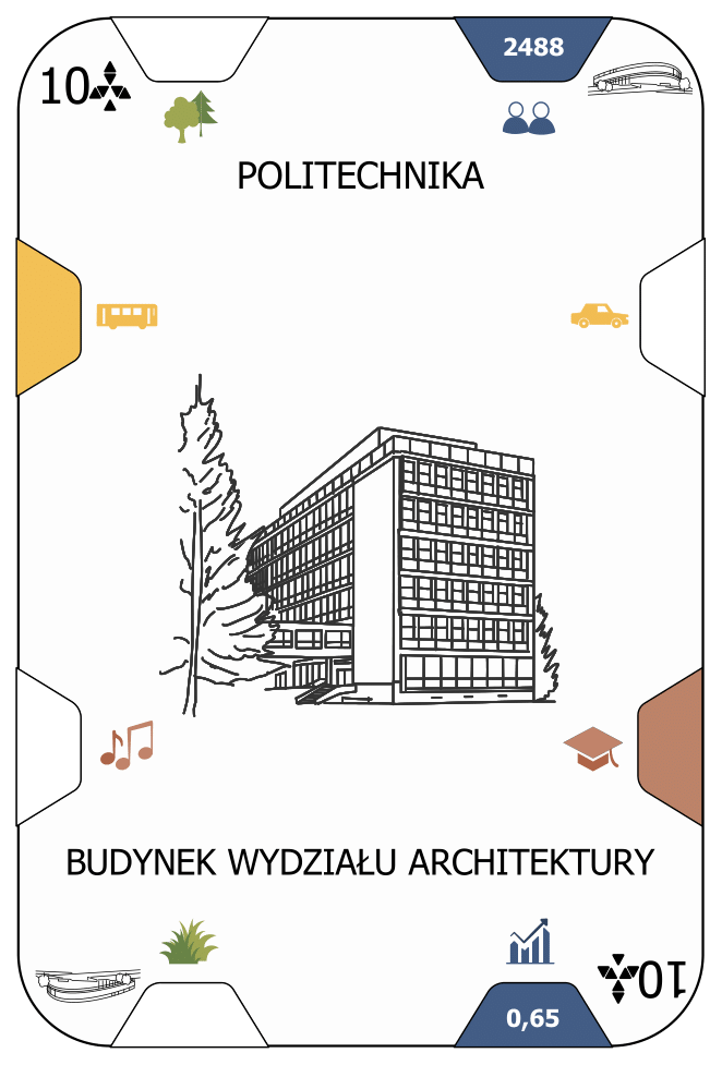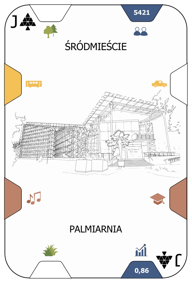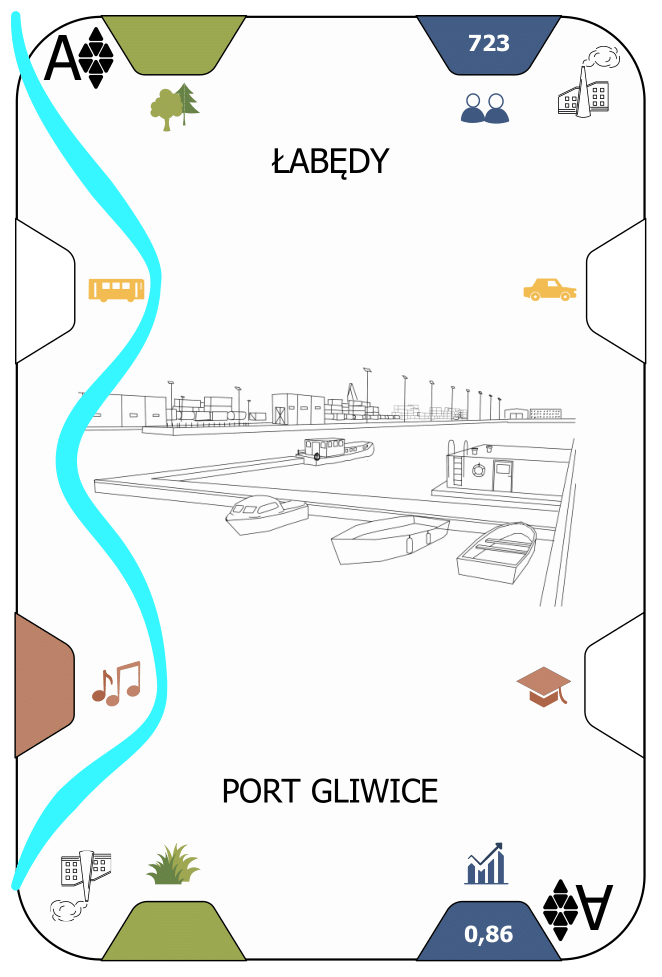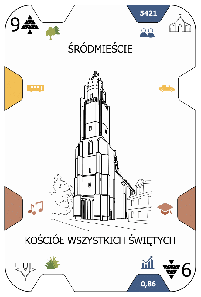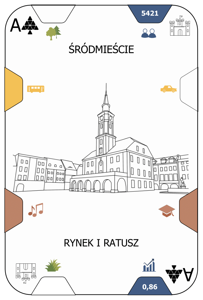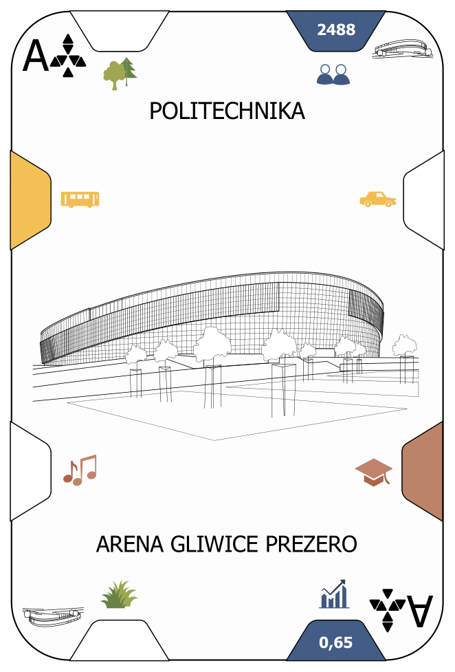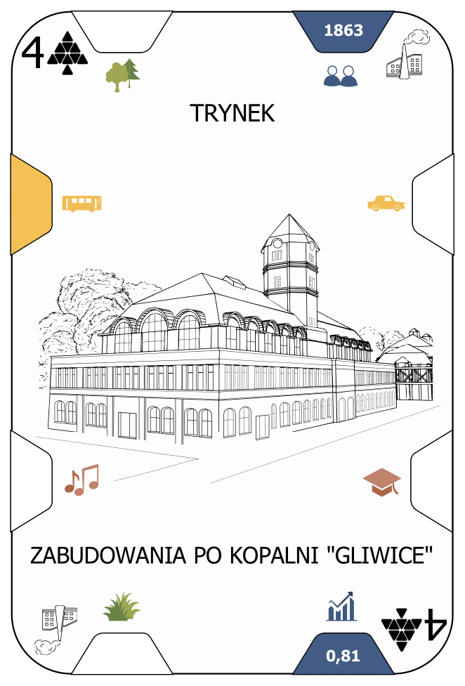 Karty podstawowe zawierające grafiki najbardziej znanych budynków i miejsc z wszystkich dzielnic Gliwic